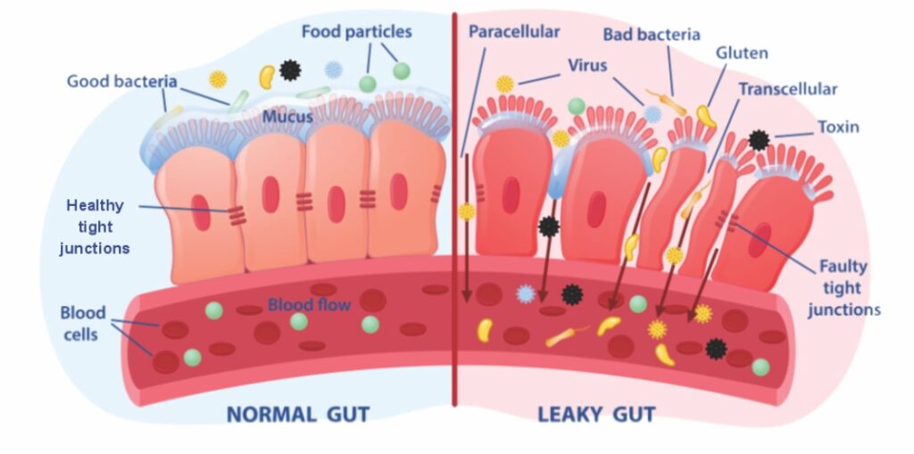 Intestinal hyperpermeability may allow the entry of harmful microorganisms, toxins, or undigested food particles through the junctions of the intestinal epithelium, reaching the bloodstream.